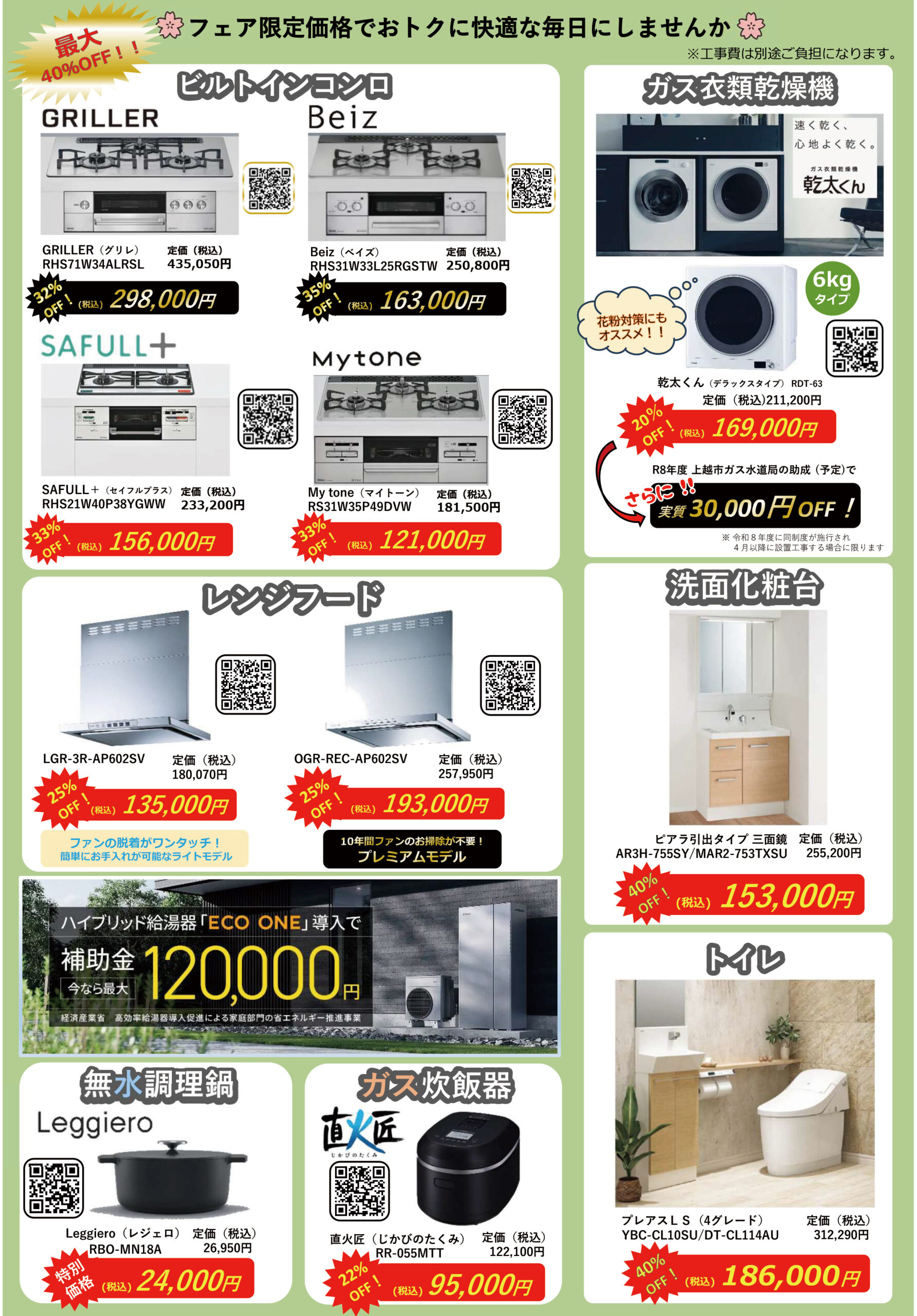 最新ガスコンロやレンジフードの展示はもちろん、イベント限定の超特価にて販売!