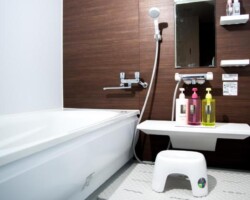 広々とした洋室のお部屋はウッドフロアで、シーティングエリア(ソファ1台付)があり、液晶テレビ、冷蔵庫と専用トイレ、専用バスルーム(シャワー、バスアメニティ付)が備わっています。
